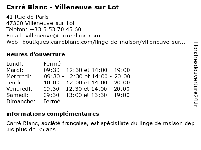 | Mardi | 09:30-12:30 et 14:00-19:00 |