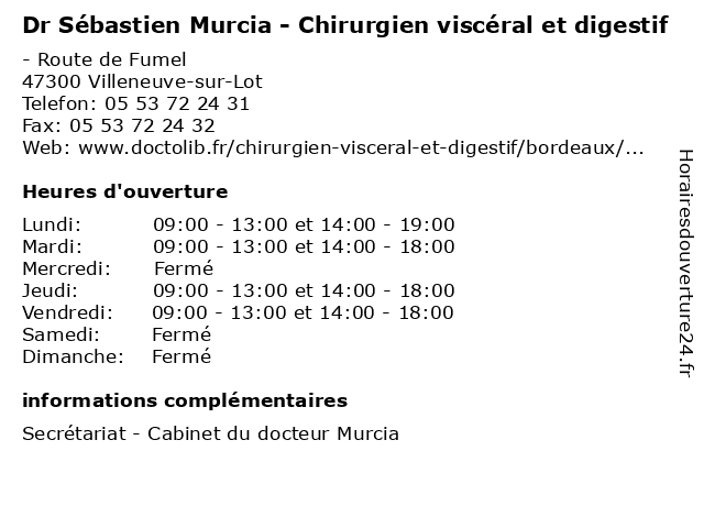 1 Dr Jean Durou - Chirurgien Viscéral et Digestif (Distance: 0,00 km) - Route de Fumel, 47300 Villeneuve-sur-Lot 47300, cabinet, chirurgien, digestif, docteurs, dr, durou, et, jean, lot, villeneuve, viscéral 2 Dr Corinne Stora - Chirurgien viscéral et digestif (Distance: 0,00 km) - Route de Fumel, 47300 Villeneuve-sur-Lot chirurgien, consultation, corinne, digestif, docteur, dr, et, med, médecin, stora, traitement, viscéral 3 Dr Dieudonné Ntirandekura - Chirurgien viscéral et digestif (Distance: 0,00 km) - Route de Fumel, 47300 Villeneuve-sur-Lot autre, chirurgie, chirurgien, consultation, dieudonné, digestif, docteur, dr, et, ntirandekura, santé, viscéral, viscérale 5 Filipozzi Sébastien SAS (Distance: 14,52 km) D667, 47380 Saint-Étienne-de-Fougères filipozzi, sas, sébastien 6 |