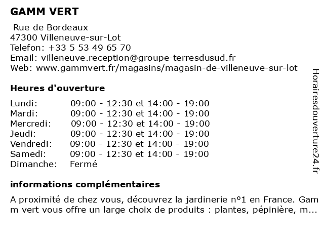 1 Gamm vert (Distance: 8,09 km) 33 Avenue René Bouchon, 47110 Sainte-Livrade-sur-Lot animalerie, gamm, jardin, jardinerie, mobilier de jardin, plantes, pépinière, vert 2 Gamm vert (Distance: 14,03 km) . MONCLAR, 47260 CASTELMORON SUR LO animalerie, animaux, gamm, horticulteur, jardin, jardinerie, vert 3 GAMM VERT (Distance: 14,59 km) Avenue de Mondésir, 47150 Monflanquin animalerie, gamm, jardin, jardinerie, mobilier de jardin, plantes, pépinière, vert 4 GAMM VERT (Distance: 14,70 km) Rue Ribalous, 47340 Laroque-Timbaut animalerie, gamm, jardin, jardinerie, mobilier de jardin, plantes, pépinière, vert 5 GAMM VERT (Distance: 15,35 km) Route de Monclar, 47260 Castelmoron-sur-Lot animalerie, gamm, jardin, jardinerie, mobilier de jardin, plantes, pépinière, vert 6 Gamm vert (Distance: 15,53 km) - Route de Monbahus, 47290 Cancon animalerie, animaux, gamm, horticulteur, jardin, jardinerie, vert  |