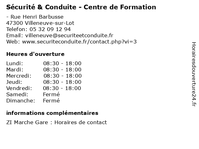 1 Etablissement de formation professionnelle du Villeneuvois (Distance: 0,17 km) Rue Henri Barbusse, 47300 Villeneuve-sur-Lot de, du, etablissement, formation, professionnelle, villeneuvois 2 École de Conduite Fabre (Distance: 1,63 km) 10 Boulevard Camille Desmoulins, 47300 Villeneuve Sur Lot auto école, code, conduite, cours, de, fabre, formation, permis, école 3 Bastardo Sécurité Incendie (Distance: 1,64 km) 310 Route de Tournon, 47300 Villeneuve-sur-Lot bastardo, incendie, sécurité 4 Ariane Sécurité Communication - PROXEO (Distance: 2,00 km) 2 avenue Jacques Bordeneuve, 47300 Villeneuve sur lot ariane, communication, proxeo, sécurité 5 Auto Sécurité - Ste livrade controle auto (Distance: 10,35 km) 7 Avenue Gaston Carrère, 47110 Sainte-Livrade-sur-Lot auto, controle, livrade, ste, sécurité 6 École de Conduite JB (Distance: 18,04 km) - Rue Gabriel Bonnet, 47260 Castelmoron-sur-Lot auto école, code, conduite, cours, de, formation, jb, permis, école |
