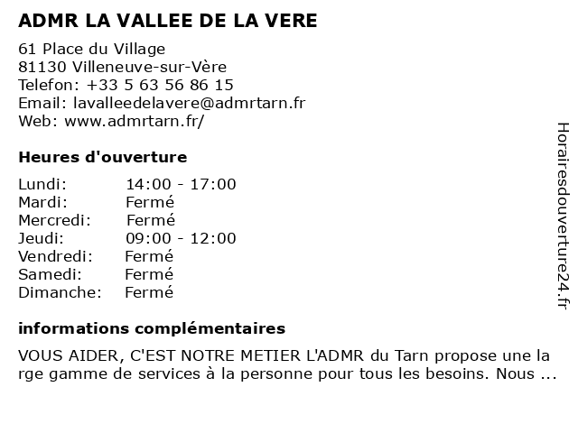 2 ADMR LES BERGES DU TARN (Distance: 9,55 km) Rue de la Mairie, 81150 Marssac-sur-Tarn admr, berges, du, les, tarn 5 ADMR SSIAD DU GAILLACOIS (Distance: 15,76 km) 460 Route de Cadalen, 81600 Brens admr, du, gaillacois, ssiad 6 |