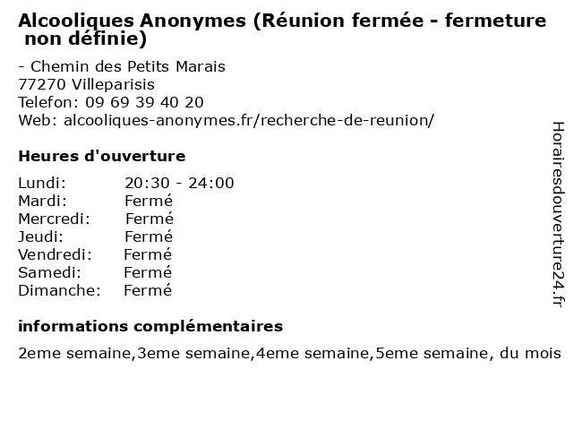 Termes de recherche pour Alcooliques Anonymes (Réunion fermée - fermeture non définie):reunion, non, fermeture, alcooliques, anonymes, définie, fermée |