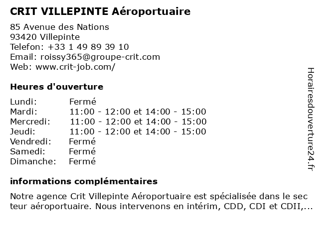 1 CRIT VILLEPINTE Logistique (Distance: 0,06 km) 85 Avenue des Nations, 93420 Villepinte crit, logistique, villepinte 3 Samsic Emploi Roissy Aéroportuaire (Distance: 4,08 km) 1 Avenue de la Demi-Lune, 95700 Roissy-en-France aéroportuaire, emploi, intérim, recrutement, roissy, samsic 4 CFDT Zone aéroportuaire de ROISSY (Distance: 4,33 km) Rue des Postes Maison des organisations syndicales de la zone aéroportuaire de Roissy (Moszar), 95700 Roissy-en-france aéroportuaire, cfdt, de, roissy, zone 5 CRIT MITRY MORY (Distance: 6,85 km) 21 bis Avenue Jean-Baptiste Clément, 77290 Mitry-Mory crit, mitry, mory 6 |