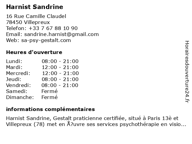 1 Sandrine Deliry - Hypnothérapeute (Distance: 2,60 km) 4 Allée des Millepertuis, 78450 Chavenay deliry, hypno, hypnose, hypnothérapeute, sandrine, sante 2 Sandrine Salmon - Masseur-kinésithérapeute (Distance: 3,25 km) 25a Rue Jean Gabin, 78390 Bois-d'Arcy docteur, kine, kinesitherapeute, kinésithérapeute, masseur, salmon, sandrine 3 Le Norcy Sandrine - Infirmier - Infirmière (Distance: 6,30 km) 7 Place Georges Pompidou, 78180 Montigny-le-Bretonneux docteur, infirmier, infirmière, le, medecins, norcy, sandrine, sante 4 Dr Sandrine Engerand - Radiologue - secrétariat (Distance: 8,96 km) 21 Rue Moxouris, 78150 Le Chesnay consultation, docteur, dr, engerand, med, médecin, médecine, radiologue, sandrine, secrétariat, traitement 5 Dr Sandrine Kamoun Zana - Chirurgie viscérale et digestive (Distance: 9,72 km) 9 bis Route de Saint Germain, 78560 Le Port-Marly chirurgie, consultation, digestive, docteur, dr, et, kamoun, med, médecin, médecine, sandrine, traitement, viscérale, zana 6 Calaf Sandrine Avocate à versailles (Distance: 10,07 km) 41 rue Paroisse, 78000 Versailles avocat, avocate, calaf, conseil, droit, sandrine, versailles |