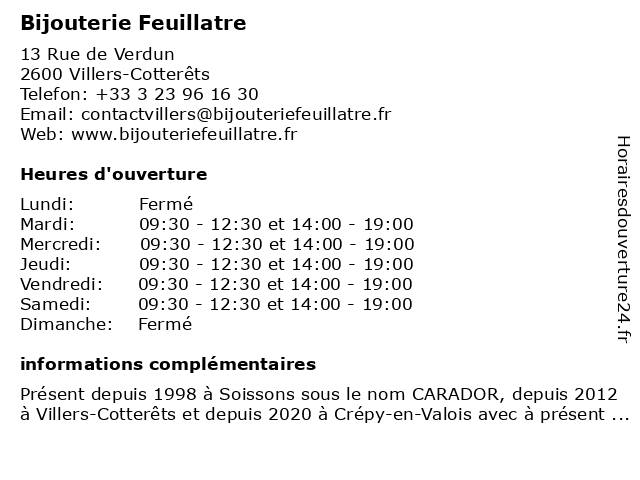1 Bijouterie Feuillatre (Distance: 14,92 km) 19 Rue nationale, 60800 Crépy-en-Valois bijouterie, feuillatre 3 POMPES FUNEBRES FEUILLATRE (Distance: 54,27 km) 102 Rue des Moulins, 93370 Montfermeil feuillatre, funebres, pompes 4 Pompes Funèbres Marbrerie Speranzini-Feuillatre (Distance: 54,54 km) 43 Avenue de Claye, 77500 Chelles feuillatre, funèbres, marbrerie, pompes, speranzini 5 Etablissements Feuillatre (Distance: 54,58 km) 49 Rue du Général Leclerc, 93370 Montfermeil etablissements, feuillatre 6 E.Leclerc Le Manège à bijoux (Distance: 0,49 km) - Avenue de la Ferté Milon, 02600 Villers-Cotterêts bijouterie, bijoux, e.leclerc, joaillerie, le, manège, montres |