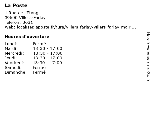 1 La Poste (Distance: 2,36 km) 65 Grande Rue, 39600 Cramans express chronopost, la, poste, réexpédition internationale 2 La Poste (Distance: 3,62 km) 30 Grande Rue, 39380 Chamblay agence, assurance, banque, banque postale, bureau de poste, chronopost, colis, courrier, dps, expéditions internationales, la, point, postale, poste, relais, timbres, téléphonie, ups, western union 3 La Poste (Distance: 4,32 km) 27 Rue de Strasbourg, 39330 Mouchard express chronopost, la, poste, réexpédition internationale 4 La Poste (Distance: 5,48 km) 9 Rue Edgar Faure, 39330 Port-Lesney express chronopost, la, poste, réexpédition internationale 5 La Poste (Distance: 6,40 km) 11 Route de Salins, 39380 Ounans express chronopost, la, poste, réexpédition internationale 6 La Poste (Distance: 7,30 km) 2 Route d'Ounans, 39380 Santans express chronopost, la, poste, réexpédition internationale |