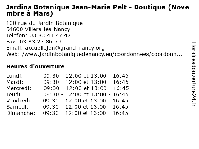 1 Jardins Botanique Jean-Marie Pelt - Jardin (Novembre à Mars) (Distance: 0,00 km) 100 rue du Jardin Botanique, 54600 Villers-lès-Nancy 1er, 31, affiches, au, botanique, jardin, jardins, jean, magnets, marie, mars, novembre, pelt, produits issus de l'agriculture biologique 2 Jardins Botanique Jean-Marie Pelt - Serres (Novembre à Mars) (Distance: 0,00 km) 100 rue du Jardin Botanique, 54600 Villers-lès-Nancy 1er, 31, affiches, au, botanique, jardins, jean, magnets, marie, mars, novembre, pelt, produits issus de l'agriculture biologique, serres 3 Parc Sainte Marie - 1er novembre au 31 mars (Distance: 2,53 km) - Rue Dupont des Loges, 54000 Nancy 1er, 31, arbre, au, espace vert, forêt, jardin, loisirs, marie, mars, nature, novembre, parc, prairie, sainte, square 4 Parc Saint Mansuy - 15 mars au 31 octobre (Distance: 3,88 km) 243 Avenue de la Libération, 54000 Nancy 15, 31, arbre, au, espace vert, forêt, jardin, loisirs, mansuy, mars, nature, octobre, parc, prairie, saint, square 5 Parc Saint Mansuy - 1er novembre au 14 mars (Distance: 3,88 km) 243 Avenue de la Libération, 54000 Nancy 14, 1er, arbre, au, espace vert, forêt, jardin, loisirs, mansuy, mars, nature, novembre, parc, prairie, saint, square 6 Parc Charles III - 1er octobre au 31 mars (Distance: 4,03 km) 109 Rue Charles III, 54000 Nancy 1er, 31, arbre, au, charles, espace vert, forêt, iii, jardin, loisirs, mars, nature, octobre, parc, prairie, square |