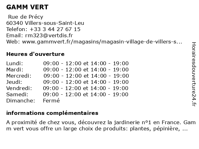 1 Gamm vert (Distance: 1,24 km) . PRESLE, 60340 VILLERS SOUS ST LEU animalerie, animaux, gamm, horticulteur, jardin, jardinerie, vert 2 Gamm Vert (Distance: 10,39 km) 39 Rue de Clermont, 60660 Rousseloy animalerie, animaux, gamm, jardinage, jardinerie, magasin, vert 3 GAMM VERT (Distance: 13,45 km) Rue Jean Jaurès, 60250 Angy animalerie, gamm, jardin, jardinerie, mobilier de jardin, plantes, pépinière, vert 4 Gamm Vert (Distance: 14,57 km) - Route de Viarmes, 95570 Villaines-sous-Bois animalerie, animaux, gamm, horticulteur, jardin, jardinerie, vert 5 GAMM VERT (Distance: 15,07 km) Route de Viarmes, 95570 Villaines-sous-Bois animalerie, gamm, jardin, jardinerie, mobilier de jardin, plantes, pépinière, vert 6 Gamm vert (Distance: 15,23 km) 49 Avenue Georges Clemenceau, 60300 Senlis animalerie, gamm, jardin, jardinerie, mobilier de jardin, plantes, pépinière, vert |