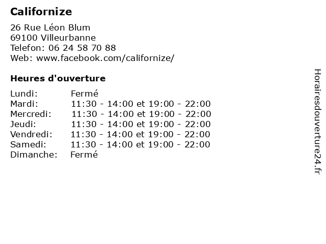| Mercredi | 11:30-14:00 et 19:00-22:00 |