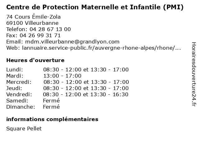 1 Centre de Protection Maternelle et Infantile (PMI) (Distance: 1,87 km) 64 Rue du 8-Mai-1945, 69100 Villeurbanne bébé, centre, de, et, infantile, maternelle, parents, pmi, protection, puéricultrice, pédiatre, vaccins 2 Centre de protection maternelle et infantile (PMI) (Distance: 1,95 km) 30 Rue de la Baïsse, 69100 Villeurbanne bébé, centre, de, et, infantile, maternelle, parents, pmi, protection, puéricultrice, pédiatre, vaccins 3 Centre de protection maternelle et infantile (PMI) (Distance: 2,09 km) 52 Avenue du Maréchal Foch, 69006 Lyon centre, conseils, de, et, infantile, maternelle, parents, pmi, protection, prévention, puéricultrice, pédiatre 4 Centre de protection maternelle et infantile (PMI) (Distance: 2,37 km) 149 Rue Pierre Corneille, 69000 Lyon centre, conseils, de, et, infantile, maternelle, parents, pmi, protection, prévention, puéricultrice, pédiatre 5 Centre de protection maternelle et infantile (PMI) (Distance: 3,03 km) 18 Rue Neyret, 69001 Lyon centre, conseils, de, et, infantile, maternelle, parents, pmi, protection, prévention, puéricultrice, pédiatre 6 Centre de protection maternelle et infantile (PMI) (Distance: 3,60 km) 71-73 Rue François-Peissel, 69300 Caluire et Cuire centre, conseils, de, et, infantile, maternelle, parents, pmi, protection, prévention, puéricultrice, pédiatre |