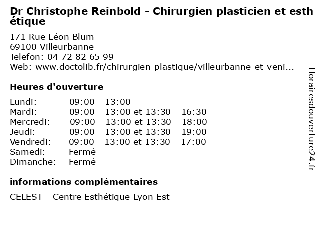1 Dr Christophe Reinbold - Chirurgien plasticien et esthétique (Distance: 0,00 km) 171 Rue Léon Blum, 69100 Villeurbanne chirurgien, christophe, consultation, docteur, dr, esthétique, et, med, médecin, médecine, plasticien, reinbold, secrétariat, traitement 2 Dr Christophe Reinbold - Chirurgien plasticien et esthétique (Distance: 1,20 km) 171 Rue Léon Blum, 69100 Villeurbanne chirurgie, chirurgien, christophe, dr, esthétique, et, general, plasticien, reinbold, soins 3 Dr Sophie Converset-Viethel - Chirurgien plasticien et esthétique (Distance: 2,11 km) 35 Rue de la Soie, 69100 Villeurbanne c2s, chirurgien, clinique, converset, docteur, dr, du, esthétique, et, generaliste, lyon, medecin, parc, plasticien, privée, sante, sophie, viethel 4 Dr Brice Flamans - Chirurgien plasticien et esthétique (Distance: 2,11 km) 35 Rue de la Soie, 69100 Villeurbanne brice, c2s, chirurgien, clinique, docteur, dr, du, esthétique, et, flamans, generaliste, lyon, medecin, parc, plasticien, privée, sante 5 Dr Jérémy Gliksman - Chirurgien plasticien et esthétique (Distance: 2,11 km) 35 Rue de la Soie, 69100 Villeurbanne c2s, chirurgien, clinique, docteur, dr, du, esthétique, et, generaliste, gliksman, jérémy, lyon, medecin, parc, plasticien, privée, sante 6 Dr Jean-Marc Torossian - Chirurgien plasticien et esthétique (Distance: 2,11 km) 35 Rue de la Soie, 69100 Villeurbanne c2s, chirurgien, clinique, docteur, dr, du, esthétique, et, generaliste, jean, lyon, marc, medecin, parc, plasticien, privée, sante, torossian |