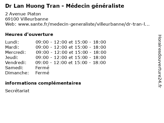 1 Alexandra Tran - Hypnothérapeute (Distance: 0,92 km) 24 Rue Waldeck Rousseau, 69006 Lyon alexandra, consultation, docteur, hypnothérapeute, med, medecine, medical, médecin, traitement, tran 2 Ly-Lan Poke Bar (Distance: 1,21 km) 18 cours Vitton, 69006 Lyon bar, boissons, bowl, lan, ly, poke, poké, restaurant, salade 3 Dr Tu Lan Allaire-Pham - Médecin généraliste (Distance: 2,17 km) 239 Avenue Félix Faure, 69003 Lyon allaire, dr, généraliste, lan, médecin, médecin généraliste, médecins, médicaments, pham, santé, secrétariat, spécialiste, tu 4 Dr. Tu Lan Allaire-Pham - Medical Generale (Distance: 2,17 km) 239 Avenue Felix Faure, 69003 Lyon allaire, consultation, docteur, dr., generale, lan, medical, pham, santé, tu 6 Tran Trung Son Olivier (Distance: 3,49 km) 19 Rue De La Charite, 69002 Lyon olivier, restaurants, tran, trung |