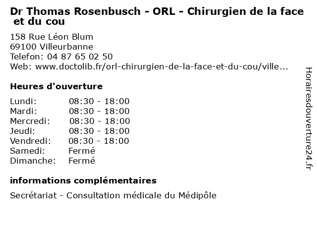 1 Dr Thomas Hostiou - Chirurgien urologue (Distance: 0,18 km) 171 Rue Léon Blum, 69100 Villeurbanne chirurgien, docteur, dr, hostiou, sante, soins, thomas, urologue 2 Dr Thomas Miras - Chirurgien-dentiste (Distance: 0,18 km) 171 Rue Léon Blum, 69100 Villeurbanne chirurgien, dentaire, dentiste, dr, implantologie, miras, parodontologie, thomas 3 Dr Christian Giroud - ORL (Distance: 2,22 km) 2 Chemin Tony Garnier, 69120 Vaulx-en-Velin care, christian, clinic, dentist, dr, france, giroud, gynécologue, health, kinesitherapeute, ophtalmologiste, orl, psychologue, service 4 Dr Claire Thomas - Médecin généraliste (Distance: 2,44 km) 133 Rue Louis Becker, 69100 Villeurbanne claire, consultation, docteur, dr, généraliste, med, médecin, thomas, traitement 5 Dr Darius Abedipour - ORL - Chirurgien de la face et du cou (Distance: 2,53 km) 163 bis Cours Emile Zola, 69100 Villeurbanne abedipour, chirurgien, cou, darius, de, dr, du, et, face, la, laryngologie, orl, oto, rhino 6 Serrurerie Albert Thomas (Distance: 2,65 km) 50 Cours Tolstoï, 69100 Villeurbanne albert, serrurerie, thomas |