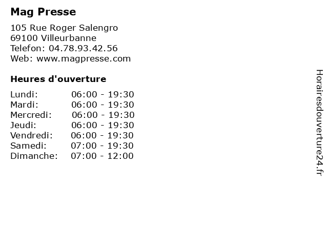 3 Mag Presse (Distance: 3,50 km) 5 Rue De Margnolles, 69300 Calauire Et Cuire mag, magazine, presse, services 4 5 Mag Presse (Distance: 4,63 km) 56 Avenue De L'europe, 69140 Rilleux La Pape mag, magazine, presse, services 6 |