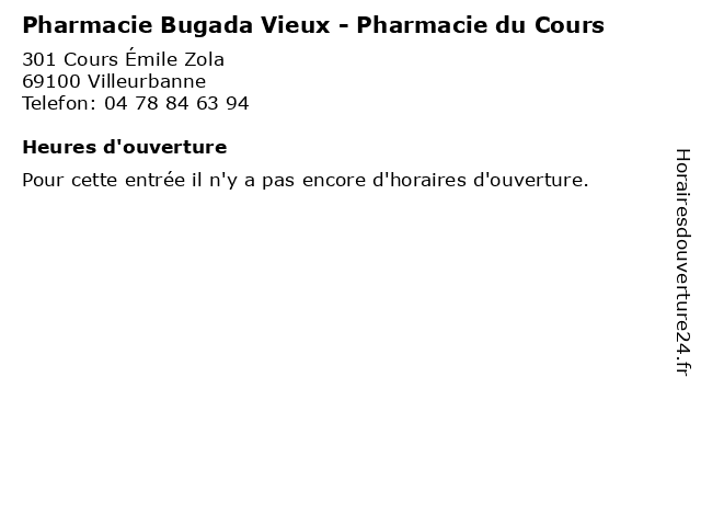 | Appeler Pharmacie Bugada Vieux - Pharmacie du Cours | |