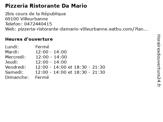 | Samedi | 12:00-14:00 et 18:30-21:30 |