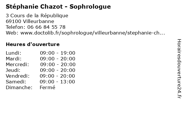 1 Célia Rouby - Sophrologue (Distance: 0,01 km) 1 Cours de la République, 69100 Villeurbanne célia, medecin, rouby, sante, sophro, sophrologue 2 Vincent Forissier - Sophrologue (Distance: 0,14 km) 45 Rue Colin, 69100 Villeurbanne forissier, sante, soins, sophrologie, sophrologue, vincent 3 Barbara Maser-Marmillon - Sophrologue (Distance: 0,66 km) 31 Cours Emile Zola, 69100 Villeurbanne barbara, marmillon, maser, medecin, sante, sophro, sophrologue 4 Anaïs Guyot - Sophrologue (Distance: 0,70 km) 85 Avenue Roger Salengro, 69100 Villeurbanne anaïs, guyot, medecin, sante, sophro, sophrologue 5 Dr Stéphanie Mosnier - Cardiologue (Distance: 1,13 km) 155 Boulevard de Stalingrad, 69006 Lyon cardio, cardiologie, cardiologue, coeur, dr, mosnier, stéphanie 6 Dr Stéphanie Gontard - Médecin généraliste (Distance: 1,13 km) 100 Rue du 4 Août 1789, 69100 Villeurbanne consultation, docteur, dr, gontard, généraliste, med, médecin, stephanie, stéphanie, traitement |