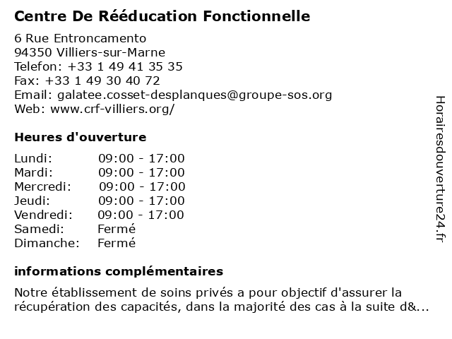 1 Groupe SOS-Centre de Rééducation Fonctionnelle (Distance: 0,21 km) 6-8 Rue Entroncamento, 94350 Villiers-sur-Marne centre, clinique, de, fonctionnelle, groupe, hôpital, hôpitaux, rééducation, santé, services, sos 2 Centre de Rééducation Fonctionnelle Livry - emeis (Distance: 9,98 km) 139 Avenue Vauban, 93190 Livry-Gargan affections de l'appareil locomoteur, centre, centre de convalescence, clinique spécialisée, de, emeis, fonctionnelle, hospitalisation complète, hospitalisation de jour, livry, médecin, neurologiques, projet de soins individualisé, rééducation, soins médicaux et de réadaptation, ssr 3 Agence Intérim JBM Médical Rééducation Bussy (Distance: 11,35 km) 1 Rue Raoul Follereau, 77600 Bussy-Saint-Georges agence, agence d'intérim médical, agence interim puteaux, agence intérim paramedical, agence intérim santé, boite interim puteaux, bussy, conseils en recrutement, emploi puteaux, intérim, intérim médical, jbm, médical, offres d'emploi, recrutement médical, rééducation 4 Dr. Florence Blum - Grossesse & Rééducation (Distance: 12,33 km) 52 Rue Léon Frot, 75011 Paris blum, docteur, dr., florence, grossesse, medecins, rééducation, sante 5 Unite Reeducation Fonctionnelle Bellan Fondation Leopold Bellan (Distance: 14,97 km) 16 Rue de l'Aqueduc, 75010 Paris bellan, fonctionnelle, fondation, leopold, reeducation, unite 6 Centre de Rééducation Fonctionnelle Port Royal - emeis (Distance: 15,39 km) 9-9 bis Rue Mechain, 75014 Paris affections de l'appareil locomoteur, centre, centre de convalescence, clinique spécialisée, de, emeis, fonctionnelle, gériatriques, hospitalisation complète, hôpital de jour, neurologiques, port, projet de soins individualisé, royal, rééducation, soins médicaux et de réadaptation, ssr |