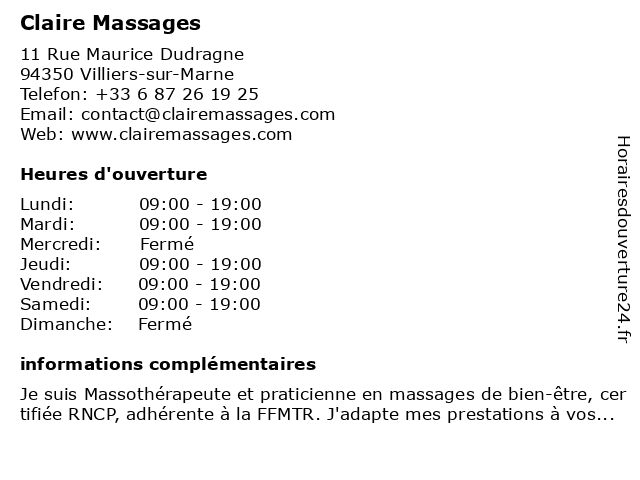1 Claire Zilliox - Masseur-kinésithérapeute (Distance: 1,16 km) 22 Clos des Cascades, 93160 Noisy-le-Grand claire, consultation, docteur, kinésithérapeute, masseur, med, medecine, medical, médecin, traitement, zilliox 2 Claire Morvrand - Diététicien (Distance: 1,22 km) 15 Clos des Cascades, 93160 Noisy-le-Grand alimentation, claire, dieteticien, diététicien, morvrand, nourriture, sante 3 Dr Jeanne-Claire Pigeot - Allergologue (Distance: 1,91 km) 206 Rue Pierre Brossolette, 93160 Noisy-le-Grand allergie, allergologie, allergologue, claire, dr, jeanne, pigeot, pneumologie, pneumologue 4 Boudeaux Marie Claire (Distance: 2,97 km) 1 Rue Victor Hugo, 93330 Neuilly-sur-Marne boudeaux, claire, marie 5 Dr Claire Grasset - Psychiatre (Distance: 3,44 km) 202 Avenue Jean Jaures, 93330 Neuilly Sur Marne claire, consultation, docteur, dr, grasset, med, medecine, medical, médecin, psychiatre, traitement 6 Brocard Claire (Distance: 5,43 km) 162 b Quai De Polangis, 94340 Joinville Le Pont brocard, claire, restaurants |
