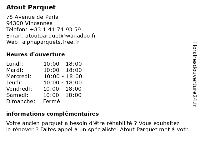 2 Poncage Parquet (Distance: 5,35 km) 20 Rue Léon Jouhaux, 75010 Paris batiment, devis, paris, parquet, poncage, superficie, travaux 3 Atout Dépannage Services (A.D.S) (Distance: 5,68 km) 42 Rue Monge, 75005 Paris a.d.s, atout, dépannage, services 4 Parquet Ibermat (Distance: 7,59 km) 4 - 8 Rue Des Artisans, 93160 Noisy-Le-Grand ibermat, noisy-le-grand, parquet, revêtements, sol 6 |