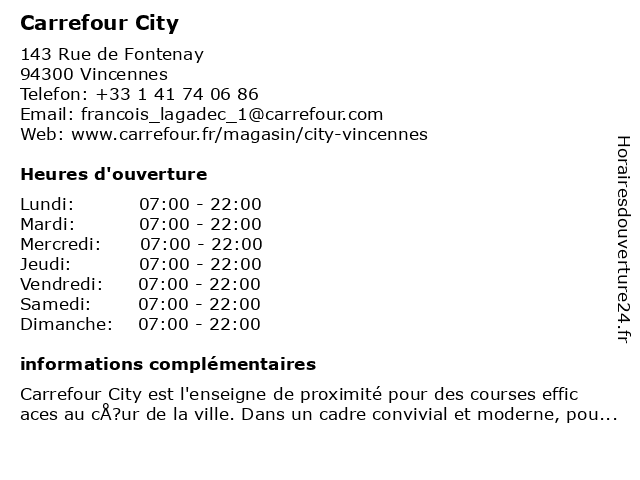 1 Carrefour City (Distance: 0,34 km) 134 Rue de Fontenay, 94300 Vincennes alimentation, carrefour, city, magasin discount, market, supermarché 2 Carrefour City (Distance: 1,00 km) 63 Rue de Paris, 93100 Montreuil alimentaire, alimentation, carrefour, city, courses, distributeur, hypermarché, supermarché, épicerie 3 Carrefour City (Distance: 2,96 km) 40 Rue de la Cour des Noues, 75020 Paris alimentation, carrefour, city, magasin discount, market, supermarché 4 Carrefour City (Distance: 3,26 km) 220 Rue du Faubourg Saint-Antoine, 75012 Paris alimentaire, alimentation, carrefour, city, courses, distributeur, hypermarché, supermarché, épicerie 5 Carrefour City (Distance: 3,29 km) 228 Rue des Pyrénées, 75020 Paris alimentation, carrefour, city, epiceries, supérette 6 Carrefour City (Distance: 3,42 km) 2 Grande Charles de Gaulle, 94130 Nogent-sur-Marne alimentaire, alimentation, carrefour, city, courses, distributeur, hypermarché, supermarché, épicerie |