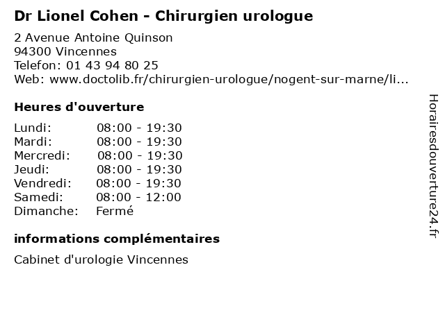 1 Dr Lionel Cohen - Chirurgien urologue (Distance: 3,53 km) 3-5 Avenue Watteau, 94130 Nogent-sur-Marne chirurgien, cohen, consultation, docteur, dr, lionel, med, médecin, médecine, secrétariat, traitement, urologue 2 Dr Lionel Cohen - Chirurgien urologue (Distance: 3,59 km) 41-49 Avenue du Maréchal Juin, 93260 Les Lilas chirurgien, cohen, consultation, docteur, dr, lionel, med, médecin, traitement, urologue 3 Maître Dina Cohen-Sabban - Avocate (Distance: 0,84 km) 3 Rue Viteau, 94160 Saint Mandé avocate, avocats, civils, cohen, dina, droits, juridiques, maître, sabban 4 Dr Jean Cohen - Radiologue (Distance: 1,30 km) 3 Rue Fernand Foureau, 75012 Paris cohen, docteur, dr, jean, médecine, radiologie, radiologue 5 Dr Michele Cohen - Médecin généraliste (Distance: 1,35 km) 4 avenue Gabriel Peri, 93100 Montreuil acupuncture, cohen, consultation, docteur, dr, généraliste, medecins, michele, médecin, rendez, santé, sur, vous 6 Jeremy Cohen - Ostéopathe (Distance: 1,61 km) 13 Rue Clément Vienot, 94300 Vincennes care, clinic, cohen, dentist, france, gynécologue, health, jeremy, kinesitherapeute, ophtalmologiste, orl, ostéopathe, psychologue, service |