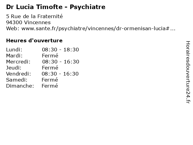 1 Dr Nathalie Rigaud - Psychiatre (Distance: 0,13 km) 157 Rue de Fontenay, 94300 Vincennes dr, folie, nathalie, psychiatre, psychiatrie, psychiatrique, rigaud 2 Dr Nathalie Vallette - Psychiatre (Distance: 0,13 km) 157 Rue de Fontenay, 94300 Vincennes dr, nathalie, psy, psychiatre, sante, soins, vallette 3 Dr Avner Perez - Psychiatre (Distance: 0,15 km) 24 Avenue Aubert, 94300 Vincennes avner, dr, folie, perez, psychiatre, psychiatrie, psychiatrique 4 Dr Marina Rymar - Psychiatre (Distance: 1,17 km) 19 Avenue Quihou, 94160 Saint-Mandé dr, marina, psy, psychiatre, rymar, sante, soins 5 Dr Thierry Haustgen - Psychiatre (Distance: 1,65 km) 77 rue Victor Hugo, 93100 Montreuil consultation, docteur, dr, haustgen, med, medecine, medical, médecin, psychiatre, thierry, traitement 6 Dr Sofia Tamzali - Psychiatre (Distance: 1,65 km) 77 rue Victor Hugo, 93100 Montreuil consultation, docteur, dr, med, medecine, medical, médecin, psychiatre, sofia, tamzali, traitement |