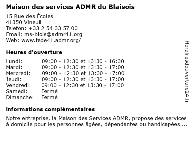 | Mercredi | 09:00-12:30 et 13:30-17:00 |