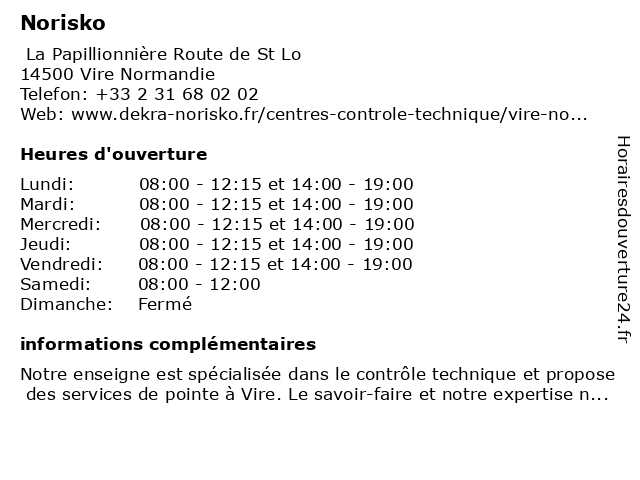 1 Centre contrôle technique NORISKO (Distance: 0,19 km) D674, 14500 Vire 4x4, camping car, centre, collection, contrôle, diesel, electrique, essence, gazole, norisko, suv, technique, utilitaire, voiture 2 Norisko (Distance: 29,86 km) 1 Route de Saint Lô, 14500 Vire automobile, controle technique, entretien, norisko 3 Centre contrôle technique NORISKO (Distance: 33,08 km) 1405 B Route de Coutances, 50180 Agneaux 4x4, camping car, centre, collection, contrôle, diesel, electrique, essence, gazole, norisko, suv, technique, utilitaire, voiture 4 Centre Contrôle technique NORISKO ControlSur Ducey (Distance: 40,40 km) 3 Les Mares, 50220 Ducey-les-Chéris 4x4, camping-car, centre, controlsur, contrôle, contrôle technique, ducey, electrique, gaz, hybride, norisko, technique, utilitaire, voiture 5 Centre contrôle technique NORISKO (Distance: 46,45 km) 22 Rue des Boissières, 50200 Coutances 4x4, camping car, centre, collection, contrôle, diesel, electrique, essence, gaz, gazole, norisko, suv, technique, utilitaire, voiture 6 |