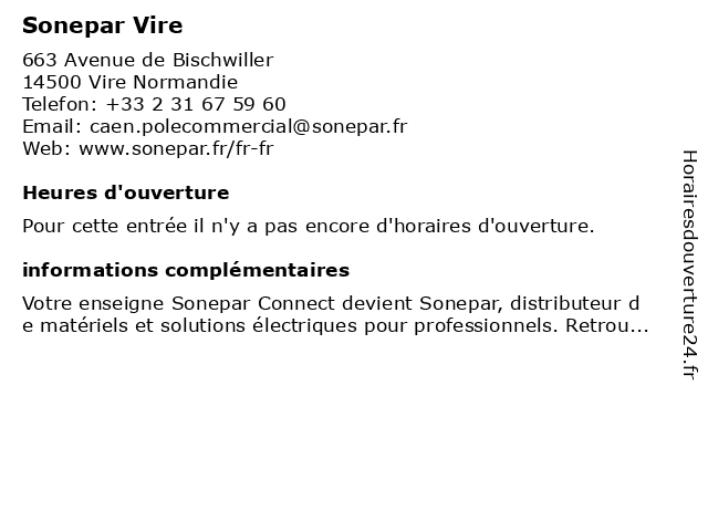 2 Sonepar Avranches (Distance: 39,74 km) Impasse le Clos du Chesnel, 50300 Avranches avranches, sonepar 3 Sonepar Bayeux (Distance: 47,41 km) 3 Rue des Longchamps, 14400 Saint-Martin-des-Entrées bayeux, sonepar |