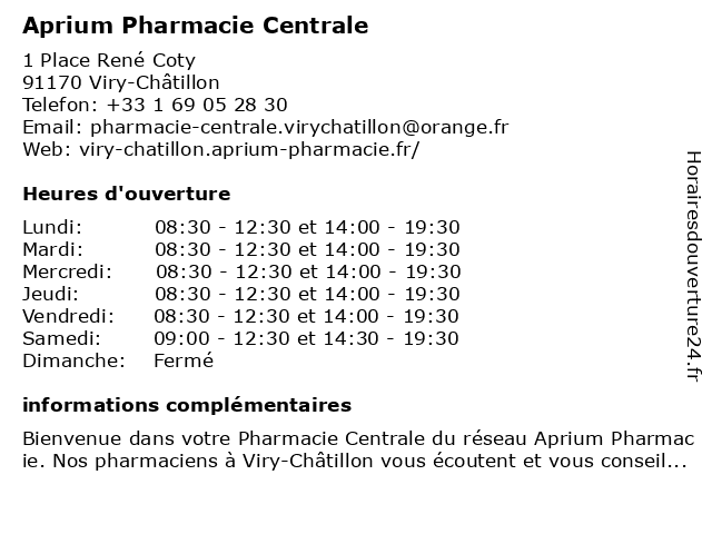 1 Pharmacie Centrale (Distance: 1,56 km) 16 Grande Rue, 91260 Juvisy sur Orge centrale, herboristerie, médicaments, paramédical, parapharmacie, pharmacie, pharmacien, santé, traitements 2 Pharmacie Centrale (Distance: 2,56 km) 28 Boulevard Aristide Briand, 91600 Savigny-sur-Orge centrale, consultations, médicaments, pharmacie, vitamines 3 Pharmacie Centrale de Draveil (Distance: 2,68 km) 1 Place de la République, 91210 Draveil centrale, consultations, de, draveil, médicaments, pharmacie, produits de beauté, soins 4 Pharmacie Centrale (Distance: 5,22 km) - Place de la Liberation, 91380 Chilly-Mazarin centrale, homéopathie, médicaments, orthopédie, parapharmacie, pharmacie 5 Pharmacie Centrale (Distance: 7,44 km) 69 rue du Général de Gaulle, 94290 Villeneuve-le-Roi centrale, herboristerie, médicaments, paramédical, parapharmacie, pharmacie, pharmacien, santé, traitements 6 Pharmacie Centrale (Distance: 7,50 km) 5 rue de la Croix Saint-Jacques, 91620 La Ville du Bois centrale, médical, médicaments, pharmacie, pharmacien, santé |