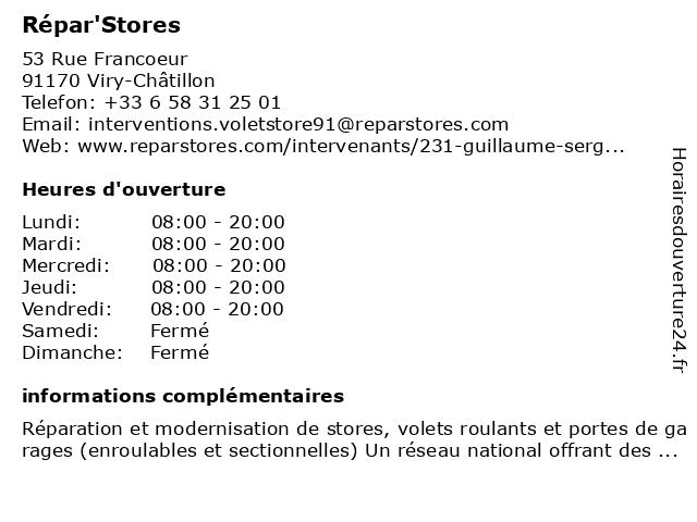 4 Stores Et Fermetures Mat (Distance: 3,09 km) 70 bis Route de Corbeil, 91360 Villemoisson-sur-Orge et, fermetures, mat, stores 5 Stores et Fonction (Distance: 7,25 km) 5 Route de Morangis, 91600 Savigny sur orge et, fonction, stores 6 Stores Fermetures Pouget (Distance: 7,27 km) 5 Route de Morangis, 91601 Savigny sur Orge fermetures, moustiquaire, pergolas, portails, pouget, stores, stores exterieurs, volets roulants |