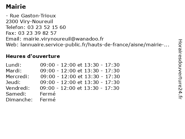 1 Mairie (Distance: 5,13 km) 128 rue de la République, 02300 Autreville administration, mairie, publique 3 Mairie (Distance: 7,03 km) 17 Grand'rue, 02300 Béthancourt-en-Vaux administration, mairie, public, service 5 Mairie (Distance: 8,47 km) - Place du Général-de-Gaulle, 02700 Barisis administration, mairie, publique 6 |