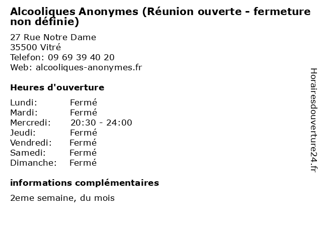 Termes de recherche pour Alcooliques Anonymes (Réunion ouverte - fermeture non définie):reunion, non, fermeture, ouverte, alcooliques, anonymes, définie |