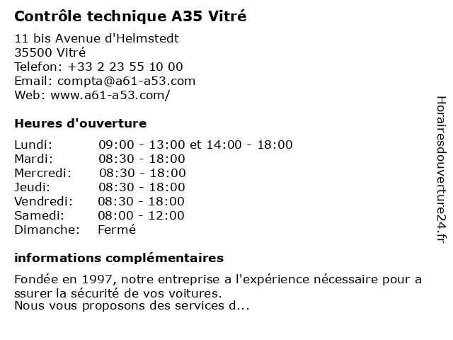 1 AS Auto Sécurité Contrôle technique Vitré (Distance: 1,24 km) 3 Rue Des Artisans, 35500 VITRE as, auto, contrôle, sécurité, technique, vitré 2 Sécuritest Contrôle Technique Automobile Vitré (Distance: 1,88 km) 1 Boulevard Denis Papin, 35500 VITRE automobile, contrôle, sécuritest, technique, vitré 3 Centre contrôle technique DEKRA Action Auto Contrôle (Distance: 3,14 km) 7 Rue de Val d'Izé, 35500 Vitré 4x4, action, auto, camping car, centre, collection, contrôle, dekra, diesel, electrique, essence, gazole, suv, technique, utilitaire, voiture 4 AS Autosécurité Contrôle Technique (Distance: 11,98 km) Route De Vitre, 35680 LOUVIGNE DE BAIS as, autosécurité, contrôle, technique 5 Sécuritest Contrôle Technique Automobile CHATEAUBOURG (Distance: 16,97 km) Za La Goulgatiere, 35220 CHATEAUBOURG automobile, chateaubourg, contrôle, sécuritest, technique 6 La Poste - Centre d'examen du code de la route (Distance: 25,00 km) Promenade Du Gué Maheu, 35300 Fougeres centre, centre d'évaluation scolaire, code, d'examen, de, du, la, poste, route, école technique |
