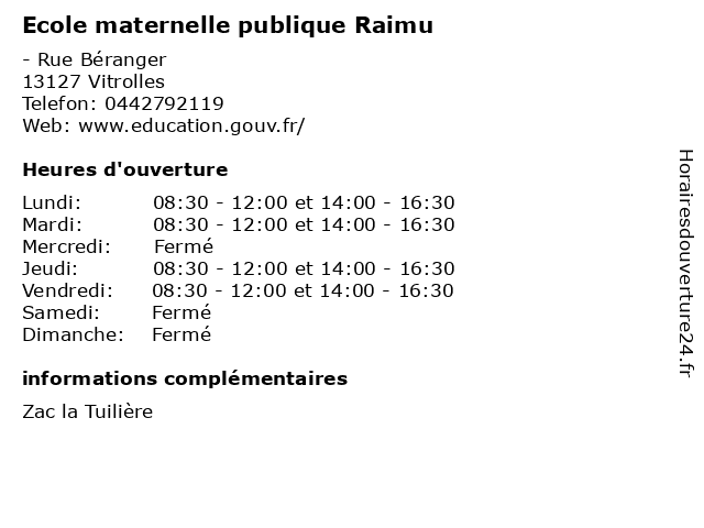 | Lundi | 08:30-12:00 et 14:00-16:30 |