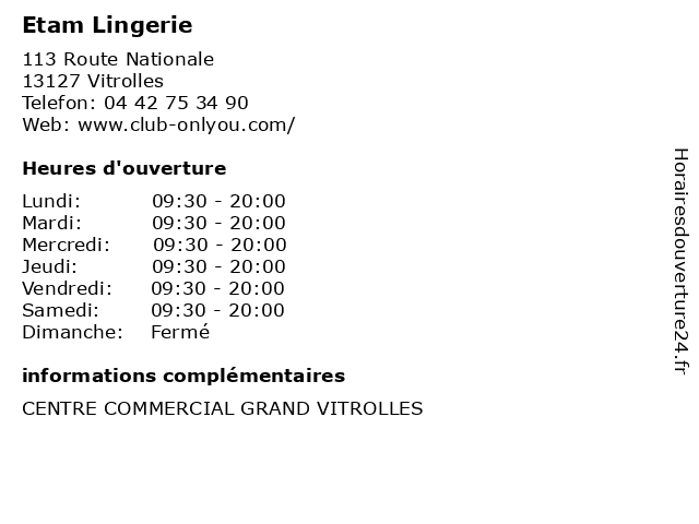1 Etam Lingerie (Distance: 0,26 km) . Plan de Campagne, 13170 Les Pennes Mirabeau beaute, cafe, chaussures, enfants, etam, hommes, lingerie, mode femmes, restaurant, sport 2 Etam Lingerie (Distance: 0,26 km) . Avenue Plan De Campagne, 13480 Cabries boutique, etam, lingerie, mode, prêt à porter 3 Etam Lingerie (Distance: 3,76 km) s/n Chemin de la Grande Campagne, 13480 Cabriès boutiques, commercial, etam, femme.centre, lingerie 4 Etam lingerie (Distance: 5,52 km) 11 Avenue de Saint Antoine, 13464 Marseille beaute, chaussures, deco, enfants, etam, lingerie, mode femmes, mode hommes, restaurant, sport 5 Etam Lingerie (Distance: 5,56 km) 15 Avenue de Saint Antoine, 13015 Marseille accessoires, caracao, culotte, etam, lingerie, magasins, nuisette 6 Etam Lingerie (Distance: 8,65 km) n/a Route nationale 113, 13127 Vitrolles etam, fashion, lingerie, women |