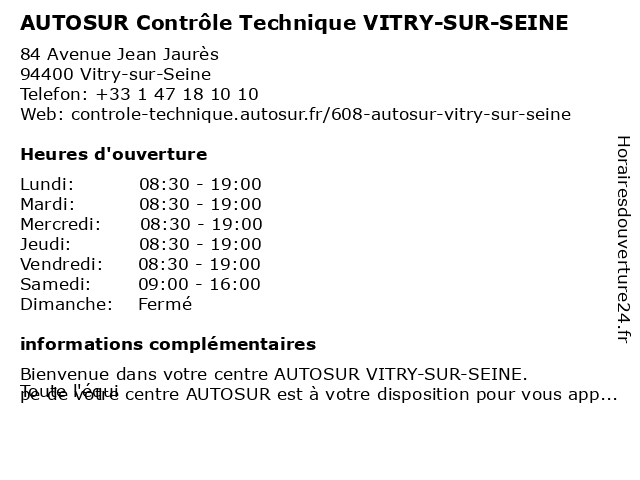 1 Action Auto Contrôle France (Distance: 1,96 km) 122 Rue Constant Coquelin, 94400 Vitry-sur-Seine action, auto, contrôle, france 3 Autosur (Distance: 4,24 km) . quartier de la Gare, 43340 Landos auto, autosur, centre, controle, obligatoire, technique, visite 4 AUTOSUR CHOISY-LE-ROI (Distance: 4,71 km) 39 Rue de la Remise aux Faisans, 94600 Choisy-le-Roi autosur, choisy, le, roi 5 Autosur (Distance: 5,35 km) 34 rue Abel Hovelacque, 75013 Paris auto repair, automotive, autosur, specific, utility 6 Centre contrôle technique Dekra (Distance: 5,42 km) 34-36 Avenue de la Victoire, 94310 Orly 4x4, camping car, centre, collection, contrôle, dekra, diesel, electrique, essence, gazole, hybride, suv, technique, utilitaire, voiture |