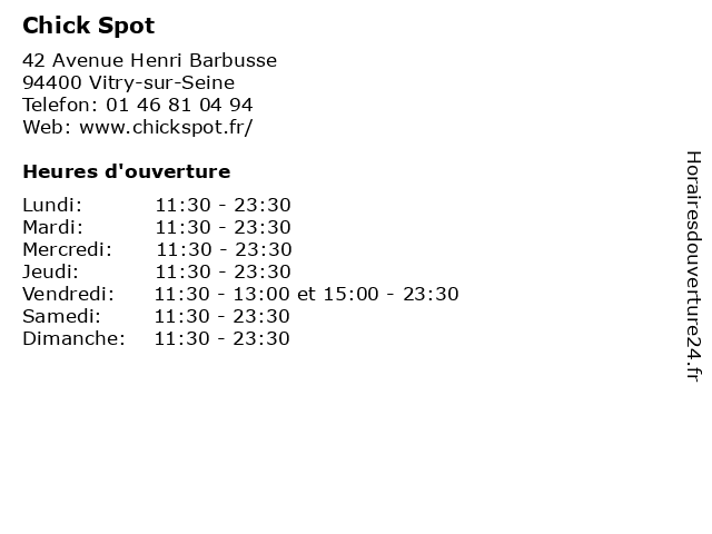 1 Chicken Spot (Distance: 0,86 km) 34 avenue Youri Gagarine, 94400 Vitry-sur-Seine boissons, burger, chicken, frites, poulet, spot 2 Chicken Spot (Distance: 2,69 km) 112 rue Etienne Dolet, 94140 Alfortville boissons, burger, chicken, frites, poulet, spot 3 Chicken Spot (Distance: 2,73 km) 88 Boulevard Paul Vaillant Couturier, 94200 Ivry-sur-Seine burger, chicken, fastfood, restaurants, spot 4 Chick n Patate (Distance: 2,73 km) 115 Rue Paul Vaillant Couturier, 94140 Alfortville chick, patate, restaurants 6 Chick End Cafe 3 (Distance: 7,98 km) 24 Avenue De La Republique, 93170 Bagnolet cafe, chick, end, restaurants |