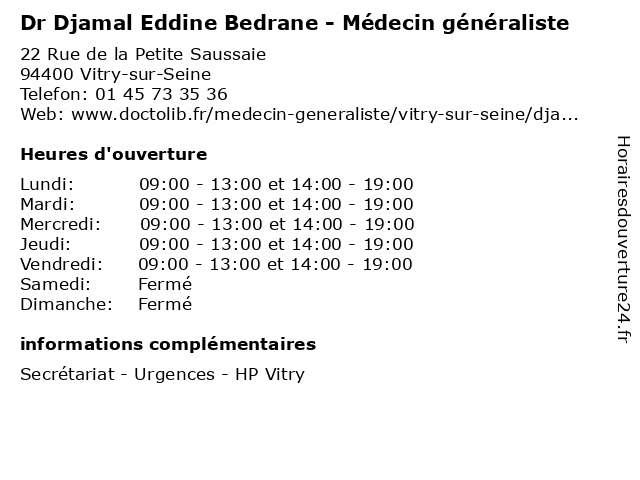 1 Dr Djamal Rahal - Médecin généraliste (Distance: 2,82 km) 4 Rue du 19 Mars 1962, 94200 Ivry-sur-Seine consultation, djamal, docteur, dr, générale, généraliste, médecin, médecine, rahal, santé 2 Maître Djamal Chibane - Avocat (Distance: 4,93 km) 125 Rue de Tolbiac, 75013 Paris avocat, avocats, cabinet, chibane, conseils, contentieux, djamal, juridique, justice, litiges, maître, services 3 Yassine Jamal Eddine - Psychologue (Distance: 7,28 km) 123 Rue de Montreuil, 75011 Paris eddine, jamal, psy, psychiatre, psychologue, sante, soins, yassine 4 Dr Djamal Chentouf - Orthopédiste (Distance: 7,60 km) 111 Rue Caron, 91200 Athis-Mons chentouf, djamal, docteur, dr, dr., medecins, orthopedie, orthopédiste, sante 5 Dr. Djamal Chentouf - Orthopédique et traumatologique (Distance: 7,62 km) 111 Rue Caron, 91200 Athis-Mons chentouf, djamal, docteur, dr., et, medecins, orthopédique, sante, traumatologique 6 Dr Djamal Yousfi - Néphrologue (Distance: 9,40 km) 36 Quai de Jemmapes, 75010 Paris des, djamal, dr, maladies, néphrologue, rénales, traitement, yousfi |