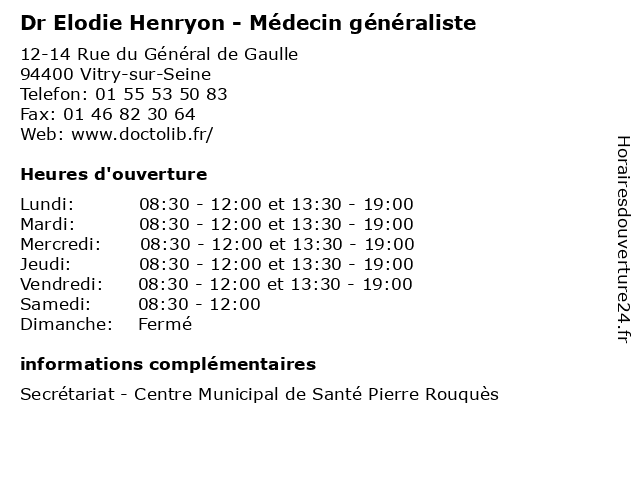1 Dr Elodie Henryon - Médecin généraliste (Distance: 12,97 km) 21 Avenue Léon Blum, 93330 Neuilly-sur-Marne docteur, dr, elodie, generaliste, généraliste, henryon, medecin, médecin, soins 2 Elodie Verdon - Ostéopathe (Distance: 0,69 km) 6 Rue Larrey, 94400 Vitry-sur-Seine actes et symptômes, elodie, expertises, ostéopathe, ostéopathie crânienne, ostéopathie de la femme enceinte, verdon 3 Dr Elodie Vallet - Médecin généraliste (Distance: 4,62 km) 44 Rue Charles Moureu, 75013 Paris dr, elodie, généraliste, médecin, médecine, médical, pharmaceutique, traitement, vallet 5 Dr. Elodie Fauveau- Explorations Fonctionnelles Neurologiques et Cardiaques (Distance: 5,16 km) 40 Avenue de Verdun, 94010 Creteil cardiaques, docteur, dr., elodie, et, explorations, fauveau, fonctionnelles, medecins, neurologiques, sante 6 Dr. Elodie Bouchart - Gynécologie-Obstétrique (Distance: 5,16 km) 40 Avenue de Verdun, 94010 Creteil bouchart, docteur, dr., elodie, gynécologie, medecins, obstétrique, sante |
