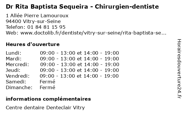 1 Da Zia Rita (Distance: 1,27 km) 48 Rue Roger Buessard, 94200 Ivry-sur-Seine da, italien, restaurants, rita, zia 2 Dr Rita-Maria Ferreira - Chirurgien-dentiste (Distance: 2,30 km) 30 Boulevard Paul Vaillant Couturier, 94200 Ivry-sur-Seine chirurgien, dentiste, dr, ferreira, maria, médecin, médecine, médical, pharmaceutique, rita, traitement 3 Rita Couto - Chirurgien-dentiste (Distance: 2,49 km) 30 Boulevard Paul Vaillant Couturier, 94200 Ivry-sur-Seine chirurgien, couto, dent, dentiste, docteur, rita, soins 4 Dr Maria Baptista - Chirurgien-dentiste (Distance: 4,71 km) 2 Rue Léo Ferré, 92220 Bagneux baptista, chirurgien, consultation, dentiste, docteur, dr, maria, med, médecin, médecine, secrétariat, traitement 5 Dr Milene Baptista - Chirurgien-dentiste (Distance: 5,14 km) 15 Rue du Puits de l'Ermite, 75005 Paris baptista, chirurgie, chirurgien, dentaire, dentiste, dr, milene 6 AXA Assurance et Banque Cohen, Tan, Baptista (Distance: 5,43 km) 10 Cours de Vincennes, 75012 Paris assurance, assurance appartement, assurance auto, assurance entreprise, assurance epargne, assurance habitation, assurance maison, assurance professionnelle, assurance santé, assurance voiture, axa, banque, baptista, cohen, et, tan |