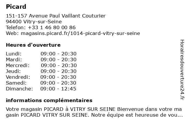 Votre magasin PICARD à VITRY SUR SEINE Bienvenue dans votre magasin PICARD VITRY SUR SEINE. Notre équipe est heureuse de vous accueillir et pourra vous conseiller avec professionnalisme et en tou...