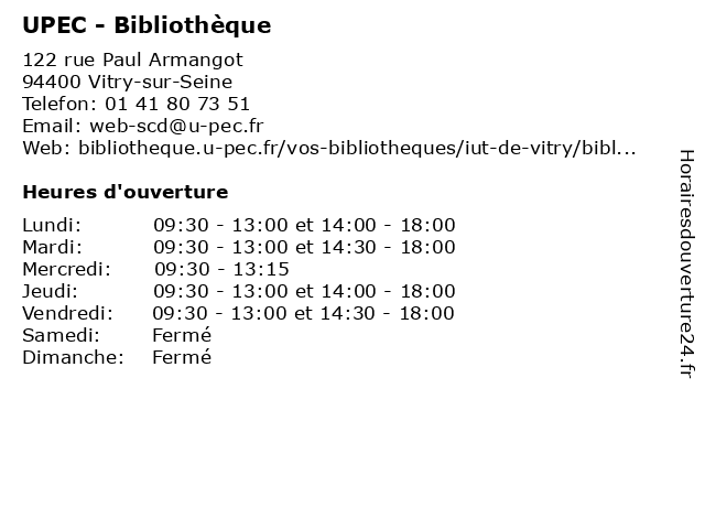 1 Bibliothèque Centre de Documentation (BCD) Ecoutez (Distance: 1,84 km) 117 Rue Balzac, 94400 Vitry sur seine bcd, bibliothèque, centre, de, documentation, ecoutez, publics, services 2 Bibliothèque (Distance: 3,41 km) 1 Allée Pierre de Montreuil, 94230 Cachan bibliothèque, cd audio, cd.rom, livres, revues 3 Upec - faculte de droit (Distance: 5,17 km) 61 Avenue Du General De Gaulle, 94000 Creteil creteil, de, droit, faculte, marne, paris, publique, santé, service, univ, upec, val 4 UPEC - Direction du Service commun de la documentation (Distance: 5,17 km) 61 avenue du Général de Gaulle, 94010 Créteil cd audio, cd.rom, commun, de, direction, documentation, du, la, livres, revues, service, upec 5 mk2 Bibliothèque (Distance: 6,19 km) 128,162 avenue de France, 75013 Paris bibliothèque, divertissement, livres, magazine, mk2 6 Bibliothèque du Haut-de-jardin - salle de lecture (Bibliothèque François-Mitterrand) (Distance: 6,31 km) . Quai François-Mauriac, 75706 Paris bibliothèque, cd audio, cd.rom, de, du, françois, haut, jardin, lecture, livres, mitterrand, revues, salle, site |