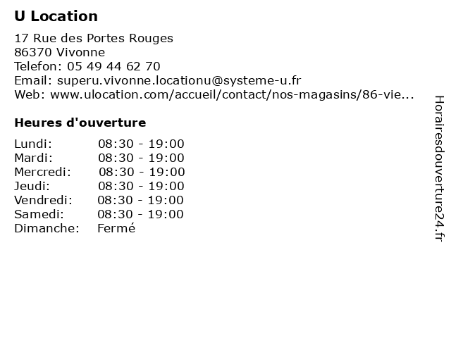 1 U Location (Distance: 14,63 km) 91 Avenue du 8 Mai 1945, 86000 Poitiers agence, location, utilitaires, véhicules 2 U Location (Distance: 19,39 km) 10 Rue de la Charletterie, 86180 Buxerolles agence, location, utilitaires, véhicules 3 Intermarché location Lusignan (Distance: 11,39 km) 63 Av saintonge, 86600 Lusignan intermarché, location, lusignan 4 Intermarché location Gencay (Distance: 12,75 km) Rue Emilien Fillon, 86160 Gençay gencay, intermarché, location 5 E.Leclerc Location (Distance: 13,21 km) R.n. 10, 40230 Saint Vincent de Tyrosse auto, e.leclerc, fourgon, location, voiture 6 EWU – Bureaux en Location (Distance: 15,58 km) 3 Rue des Courlis, 86280 Saint-Benoît bureaux, coworking, en, espace, ewu, la, location, saint-benoît, une |