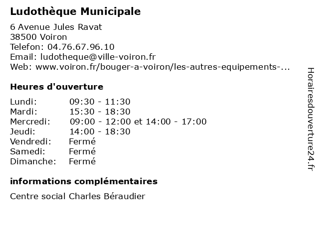 1 Piscine Municipale - Les Dauphins du parc (petites vacances) (Distance: 0,59 km) 12 rue Mainssieux, 38500 Voiron aqua, aquatique, dauphins, du, les, municipale, parc, pendant, petites, piscine, vacances 2 Piscine Municipale - Les Dauphins du parc (été) (Distance: 0,59 km) 12 rue Mainssieux, 38500 Voiron 26, août, aqua, aquatique, au, dauphins, du, juillet, les, municipale, parc, piscine, été 3 Piscine municipale Les Bannettes (période scolaire) (Distance: 8,31 km) - Chemin des Buis, 38340 Voreppe aqua, aquatique, bannettes, les, l’année, municipale, pendant, piscine, public, période, scolaire 4 Piscine municipale Les Bannettes (été) (Distance: 8,31 km) - Chemin des Buis, 38340 Voreppe aqua, aquatique, bannettes, d'été, les, municipale, pendant, piscine, public, vacances, été 5 Bibliothèque municipale - hors vacances scolaires (Distance: 10,42 km) 35B rue des écoles, 38850 Villages du lac de Paladru bandes dessinées, bibliothèque, comics, hors, jeunesse, littérature générale, municipale, scolaires, vacances 6 Aire Municipale et Euro-Relais (Borne campings-car) (Distance: 17,94 km) - Le Bourg, 38380 Saint-Pierre-de-Chartreuse aire, borne, camping, campings, car, eau, et, euro, municipale, relais, stationnement, tourisme, vidange |