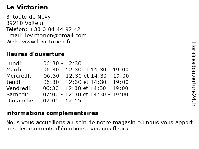 1 Restaurant au Petit Victorien (Distance: 0,58 km) 3 Rue de Beaumont, 39210 Voiteur au, petit, restaurant, victorien 2 BOULANGERIE VICTORIEN FUMEY (Distance: 12,25 km) 355 Route de Lyon, 39570 Messia-sur-Sorne bonbons chocolats fait maison, boulangerie, fumey, pain, pain au levain cuit au bois, pain cuit au feu de bois, pannetone fait maison, patisseries artisanales, snaking, victorien, viennoiserie artisannale brioche pur beurre |