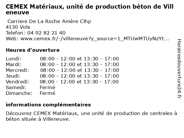 Termes de recherche pour CEMEX Matériaux, unité de production béton de Villeneuve:de, villeneuve, unité, materiaux, beton, production, cemex, fournisseur de matériel pour le béton |