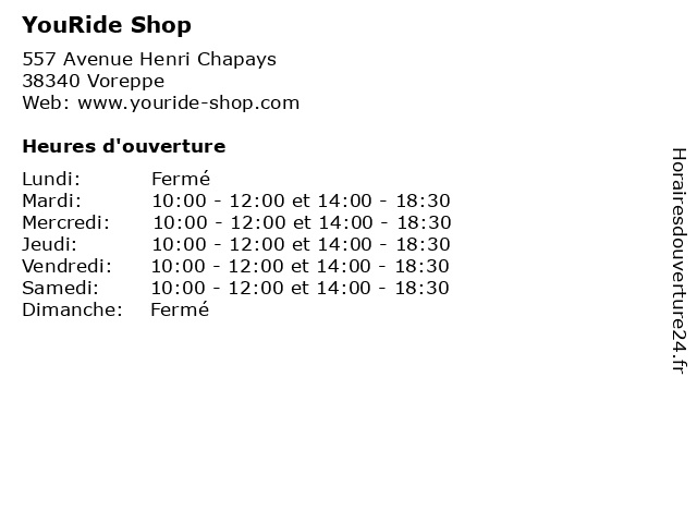 | Samedi | 10:00-12:00 et 14:00-18:30 |