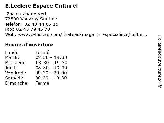1 E.Leclerc Espace culturel (Distance: 2,46 km) . Chene Vert, 72500 Vouvray sur Loir culturel, e.leclerc, espace, service, services, services à la personne 2 E.Leclerc Jardi (Distance: 0,08 km) Zac du chêne vert, 72500 Vouvray Sur Loir e.leclerc, jardi, Équipement pour échafaudage 3 E.Leclerc Chateau (Distance: 0,09 km) 47 Rue nationale, 72500 Vouvray Sur Loir chateau, e.leclerc, supermarchés 4 E.Leclerc Manège A Bijoux (Distance: 0,09 km) Zac du Chêne Vert Chateau du Loir, 72500 Vouvray Sur Loir bijoutier, bijoux, création de bijoux, e.leclerc, magasin de montres, manège, réparation de montres 5 E.Leclerc Station Service (Distance: 0,16 km) Zac du chêne vert, 72500 Vouvray Sur Loir e.leclerc, fournisseur de gaz, fournisseur de gaz propane, service, station 6 La Halle Chateau Sur Loir Leclerc (Distance: 0,18 km) Rue du Chemin Vert, 72500 Vouvray-sur-Loir chateau, halle, la, leclerc, loir, sur |